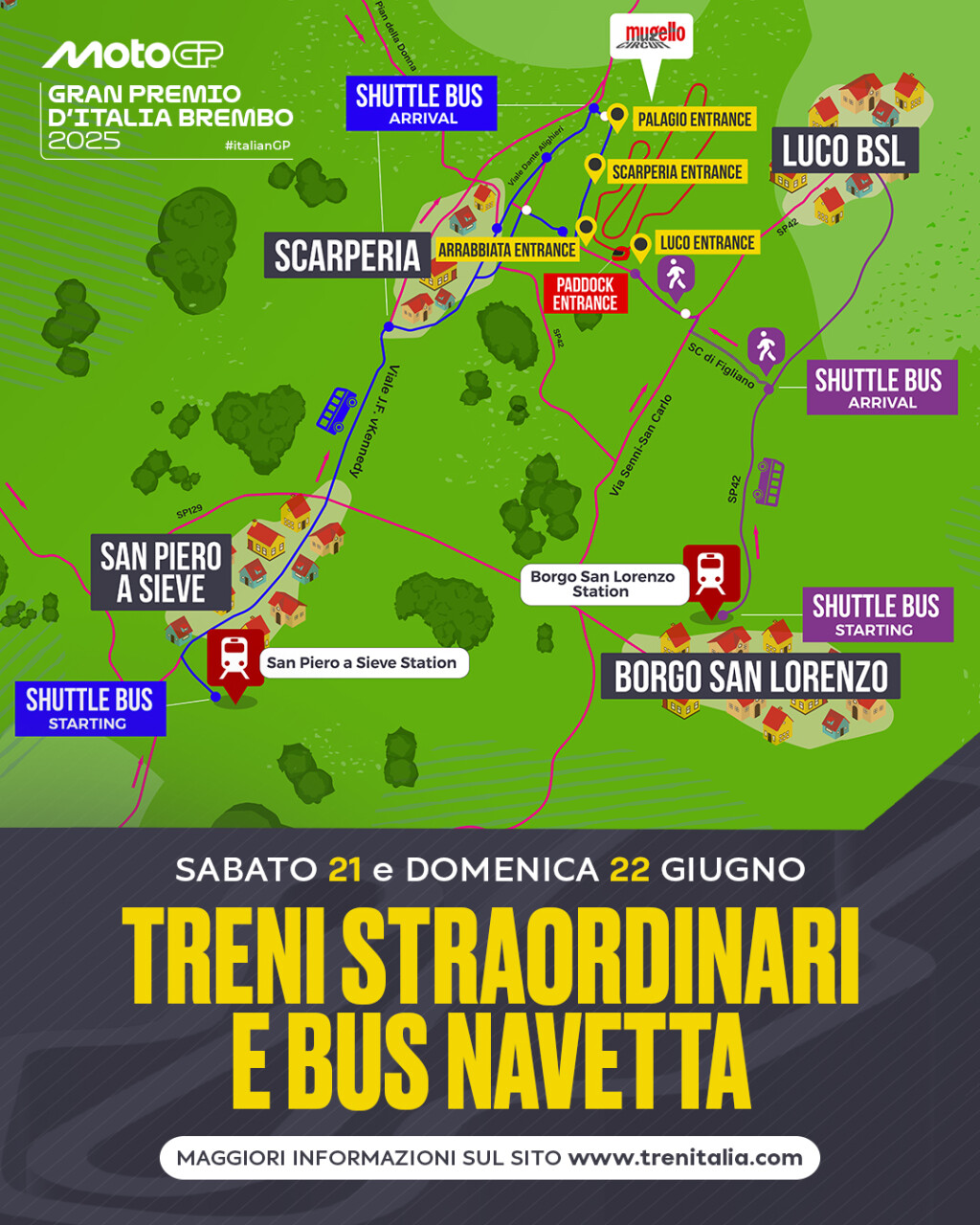 I cancelli si sono aperti oggi pomeriggio per camper e campeggiatori della prima ora. Il circuito è sempre raggiungibile grazie alle navette, che dalle stazioni ferroviarie di Borgo San Lorenzo e San Piero, partiranno in direzione Autodromo del Mugello. Per l’occasione saranno allestite sette corse straordinarie e posti extra sui treni ordinari