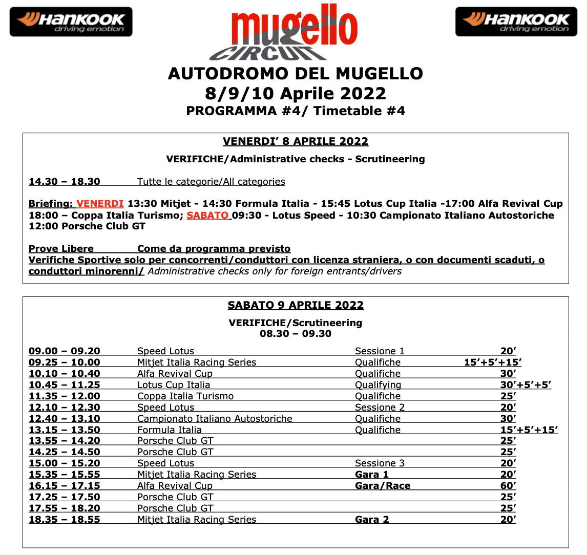 Sabato Giornata di qualifiche di tutte le classi, dalle 9:00 alle 15:20. Di seguito, e le prime gare del campionato Mitjet Italia e dell’Alfa Revival Cup, dalle 15:35 alle 18:55.