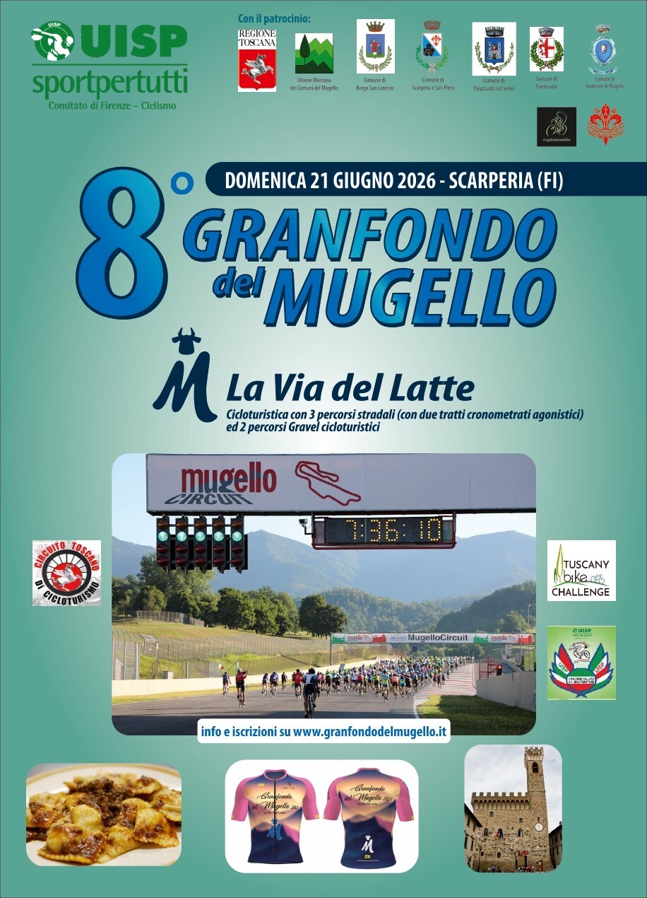 Domenica 21 giugno 2026 il Mugello Circuit ospiterà come negli anni precedenti, la partenza della 8^ edizione della GRANFONDO DEL MUGELLO , manifestazione cicloturistica con due tratti cronometrati agonistici, la manifestazione è stata negli ultimi 4 anni la cicloturistica toscana con più numero di partecipanti con una media annua di oltre 1000 iscritti provenienti da ogni parte d’Italia e dall’estero.