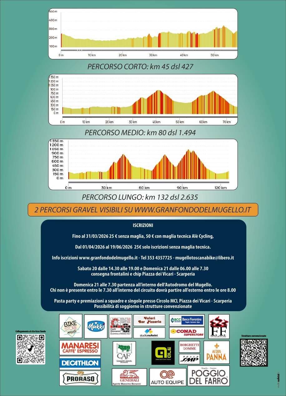 Galliano-Panna e Passo Della Sambuca, completamente chiusi al traffico , mentre invece chi sceglierà i percorsi gravel potrà godersi in tutta tranquillità il meraviglioso paesaggio percorrendo suggestive strade bianche, l’arrivo per tutti i percorsi sarà nella splendida P.za dei Vicari a Scarperia ; durante tutti i percorsi sono previsti numerosi ristori con prodotti tipici locali e alla fine pasta party finale con i famosi “tortelli mugellani”. Possono partecipare tutti i tesserati FCI o enti EPS in regola con il tesseramento 2026 o anche i non tesserati con un supplemento di 10 euro per assicurazione giornaliera, sono ammesse tutti i tipi di bici (e-bike comprese , che non possono però essere inserite nella classifica individuale agonistica).